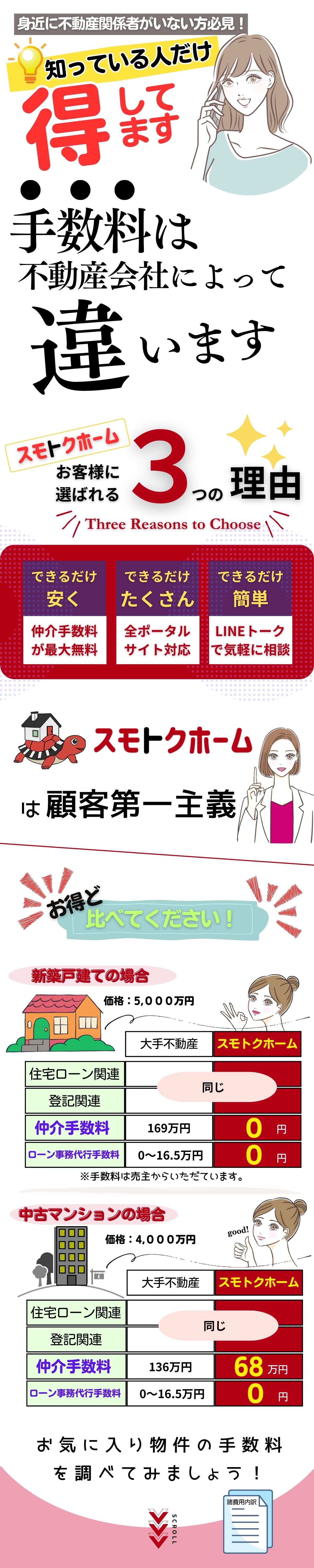 新築一戸建てで仲介手数料が無料にならない物件もわずかですが市場に存在します。そこで「最大」と付いています。また、売主分譲会社が直でしか販売していない物件は取扱いができません。まずは仲介手数料無料診断にお問い合わせください。