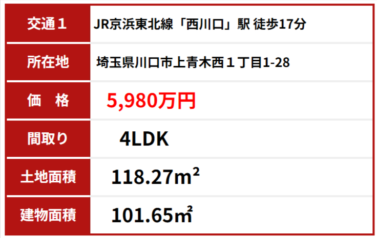 西川口駅 徒歩17分の物件のご購入はご安心してスモトクホームにお任せください。