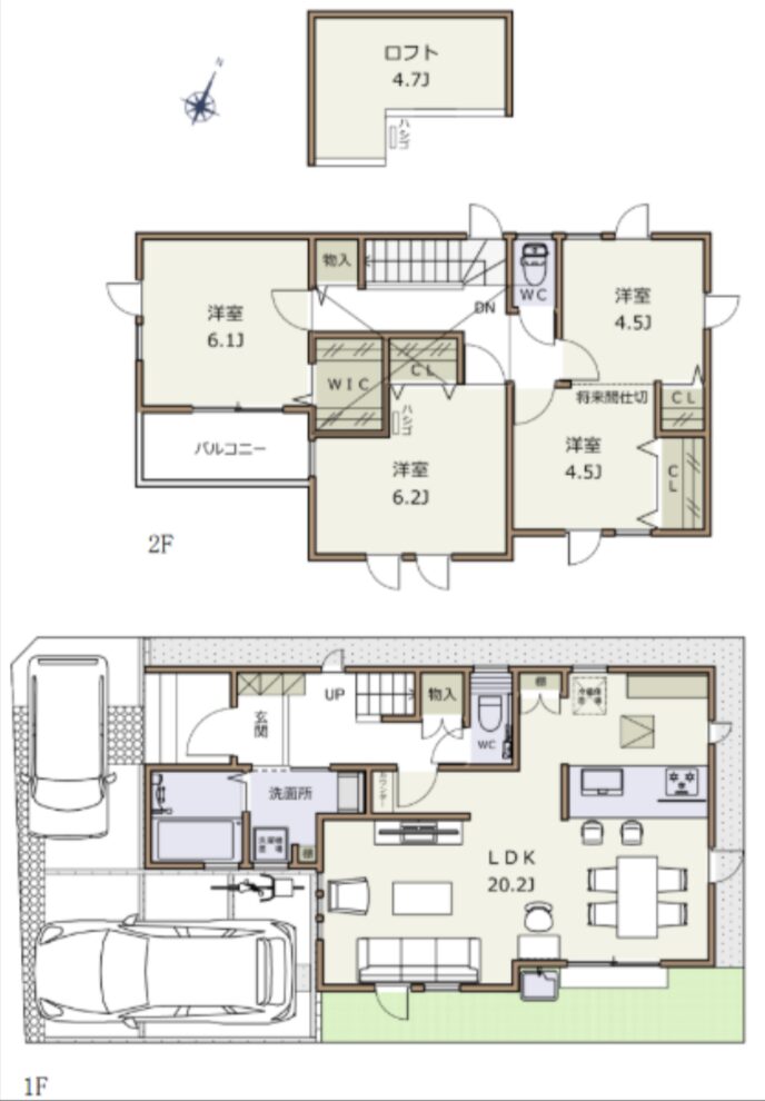 リビングが20帖以上と広く、カースペース2台確保可能!