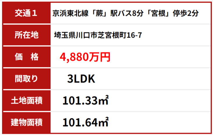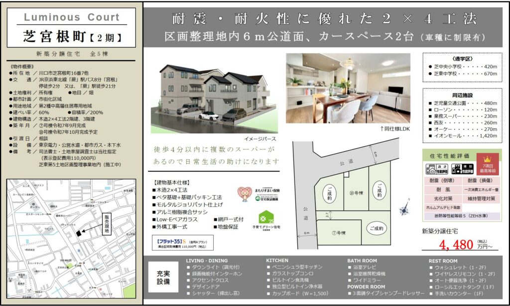 川口市芝宮根町2期全5棟(7号棟)を当初の価格4,880万円で計算すると約約163万円がスモトクホームで購入するとお得になります。