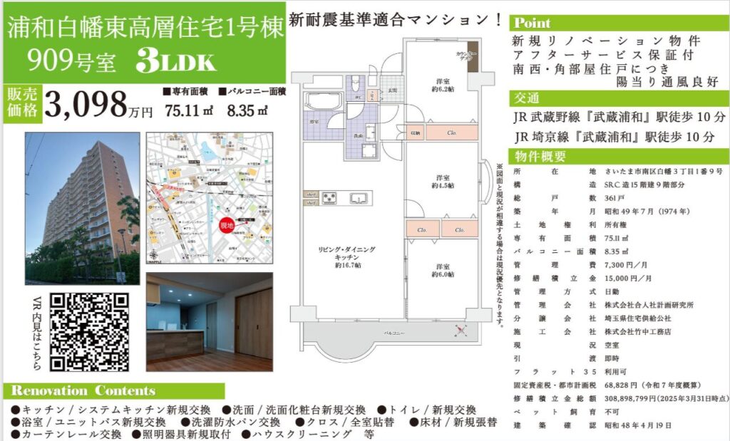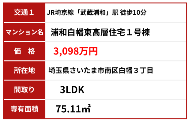 浦和白幡東高層住宅1号棟を当初の価格(3,098万円)で仲介手数料を計算すると52万円がスモトクホームで購入するとお得になります。